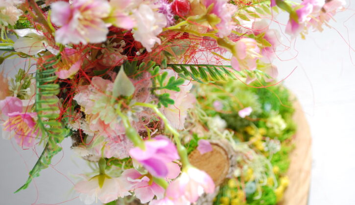 高品質な造花は、ケア次第で半永久的に美しさを保つことができます。再生PET由来のポリエステルや再生ポリエチレンが配合された花材を積極的に使用し、フローラルフォームの削減(技術と自然素材の補助使用でフォームの使用を最小限にする)、クリーニング・ケア(ほつれカット、張りの復活、染織、分解など)、不用品や古道具のリサイクル活用、不用になった造花回収にも積極的に取り組んでいます。