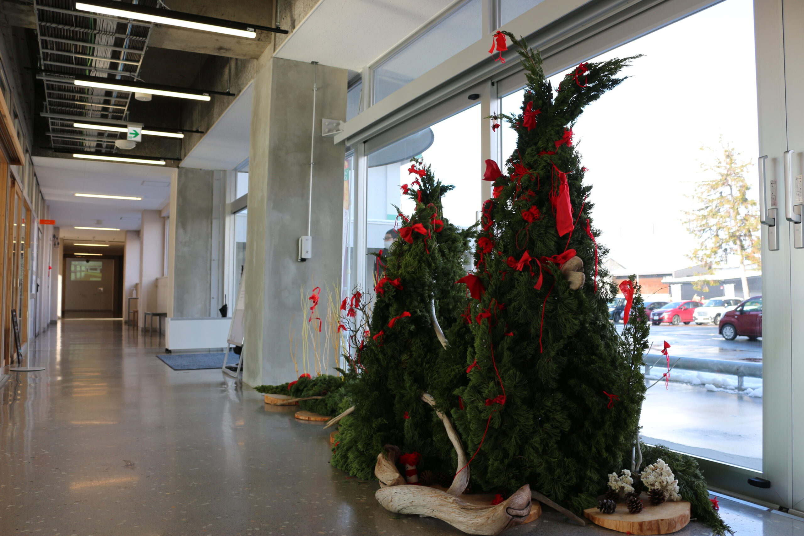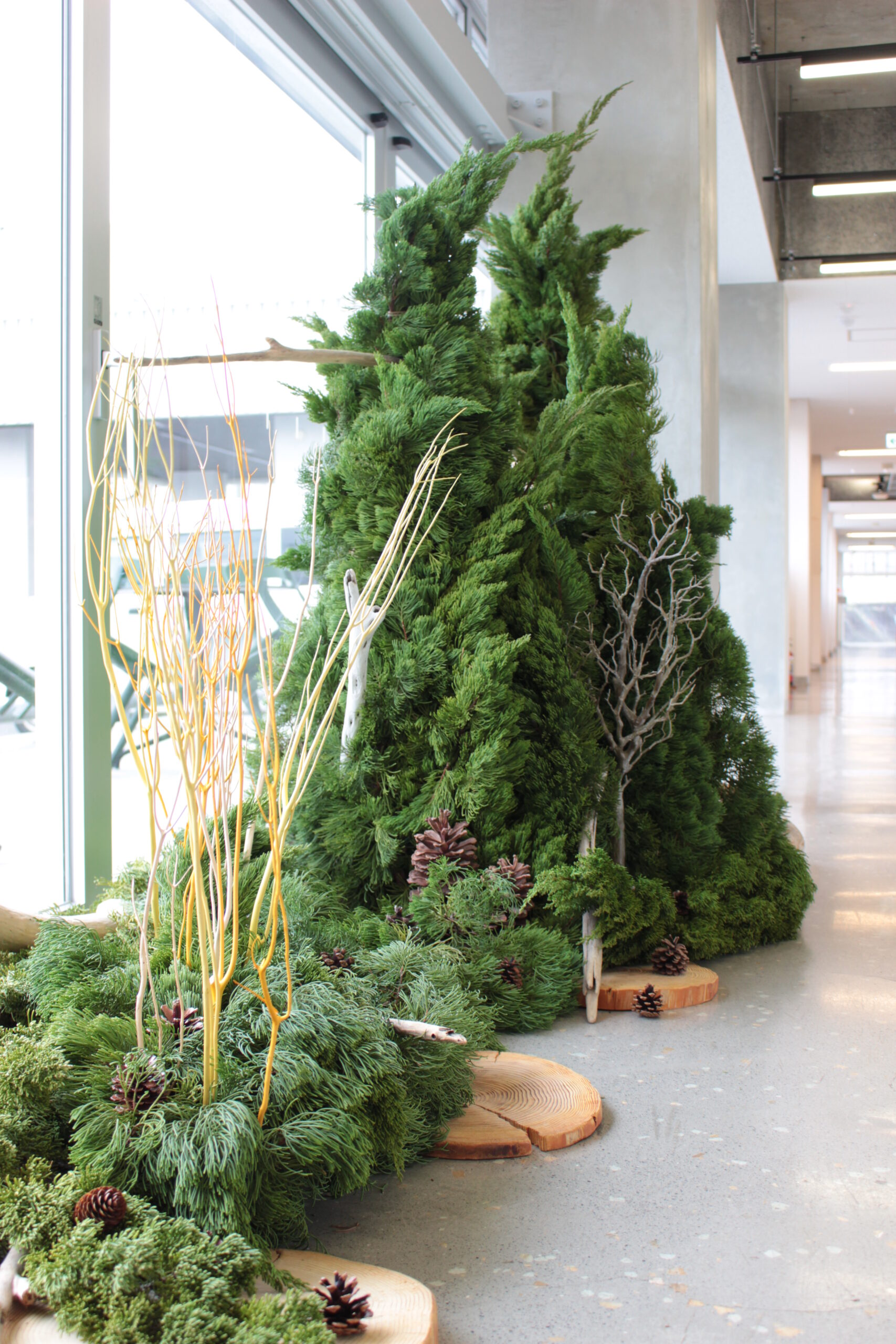 施設内に植えてあるカイズカイブキを剪定し、その枝を生かしてクリスマスツリーを組み立てています。