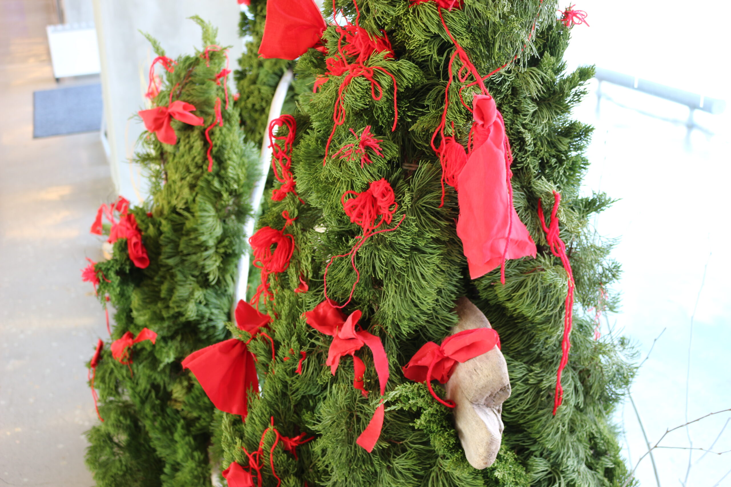 降り積もる雪をイメージして、赤い糸や布ハギレなどを切ったり結んだり形にして。